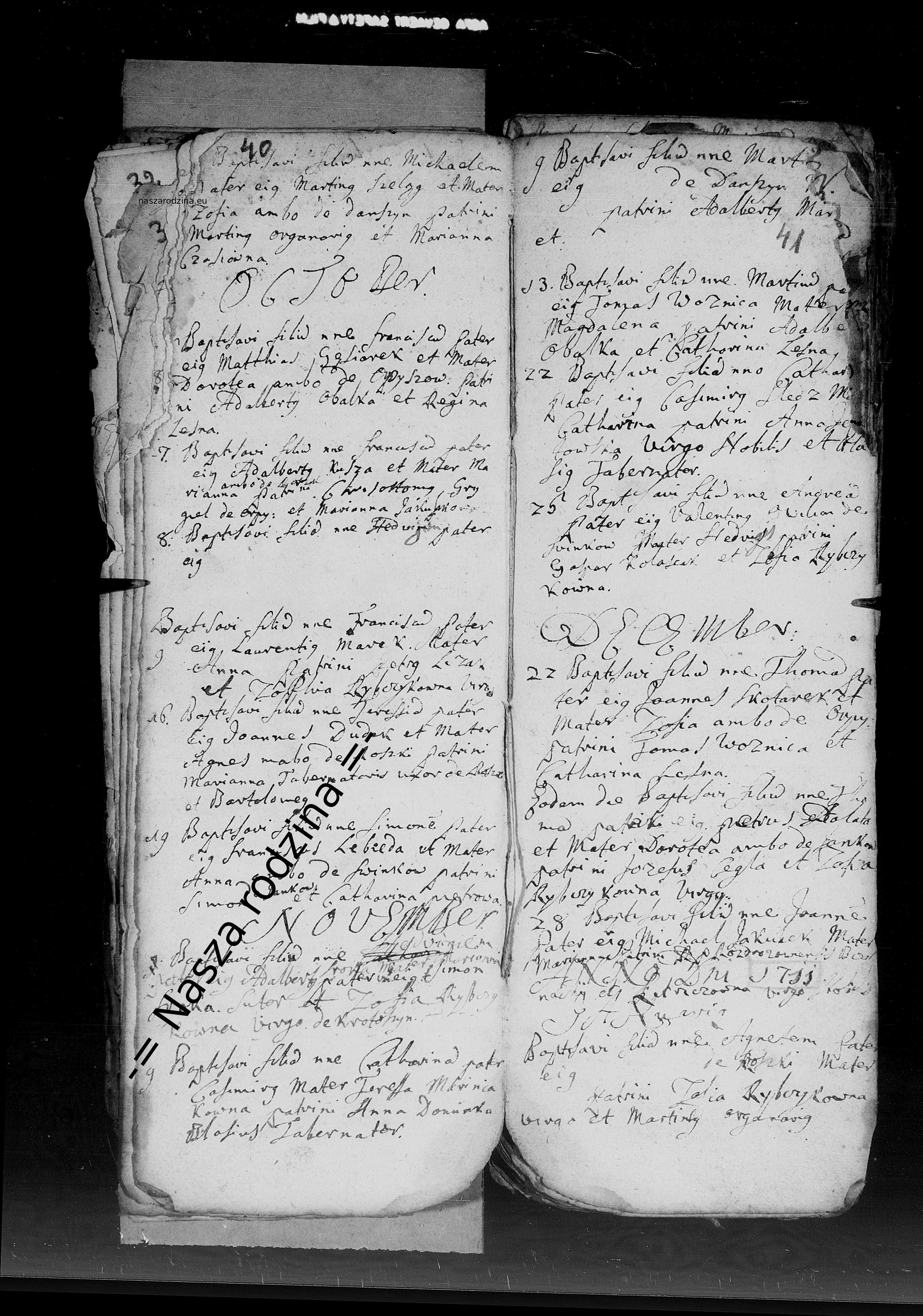 | Urodziny | listopad 1710 30 Tekst: Baptisani filius nne Franciscus pater Matthias Gęsiarek et mater Dorotea ambo de Orpyszew patrini Adalbertus Obalka et Regina Leśna |
